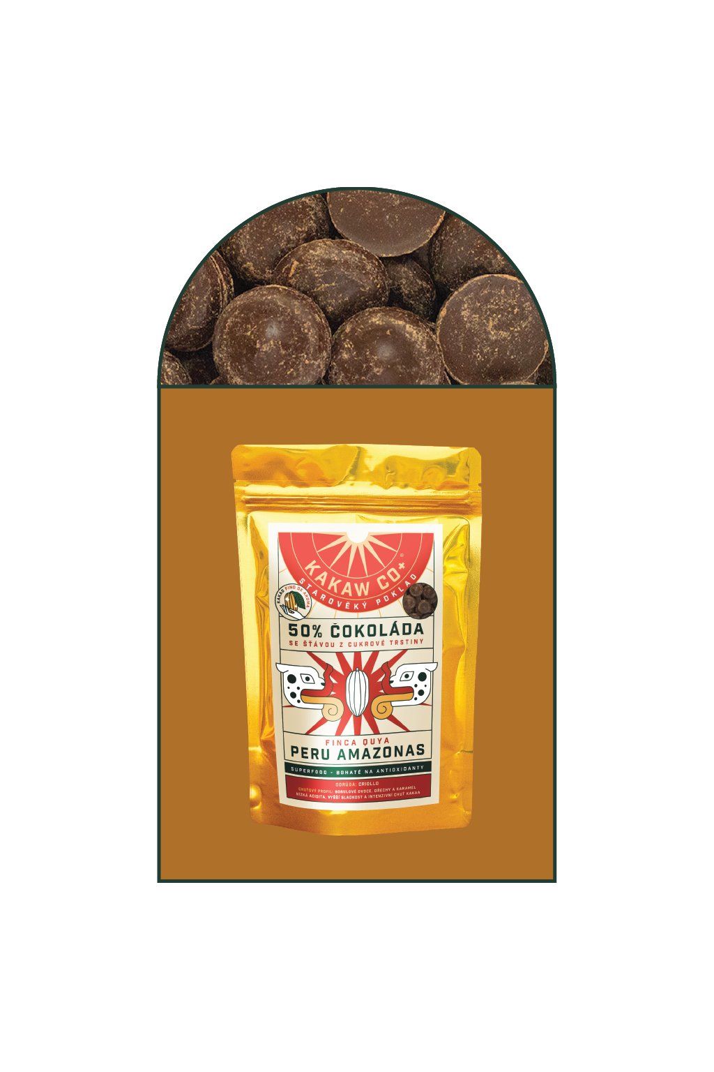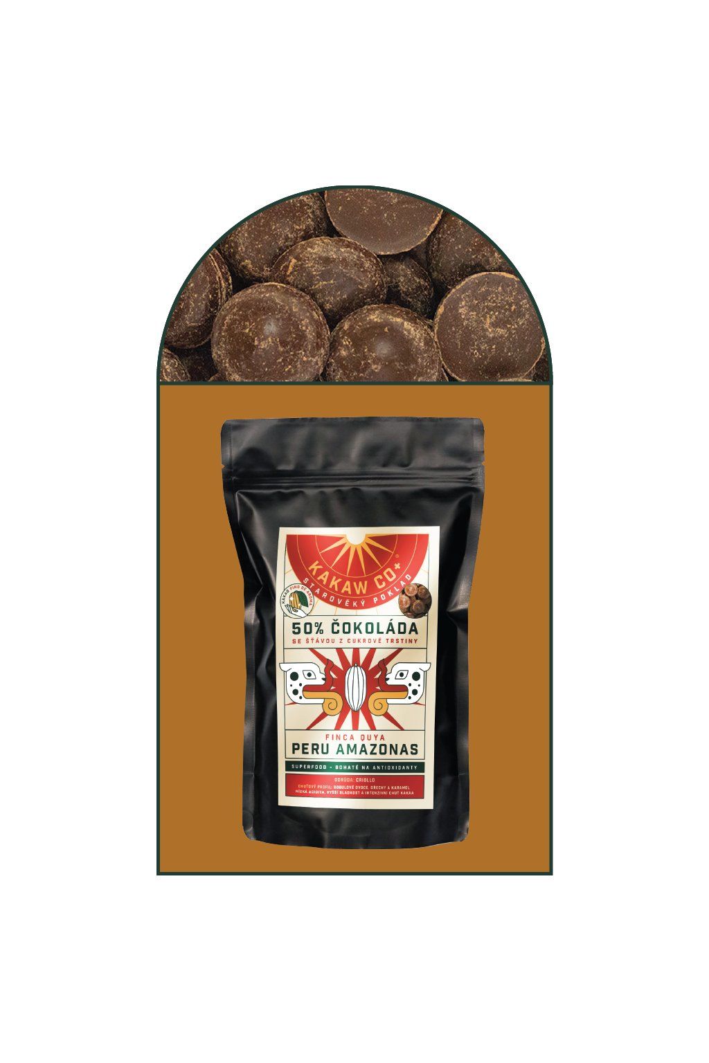 50 % plnotučná, nealkalizovaná přírodní kakaová hmota, panela – nerafinovaná šťáva z cukrové třtiny, kakaové máslo
