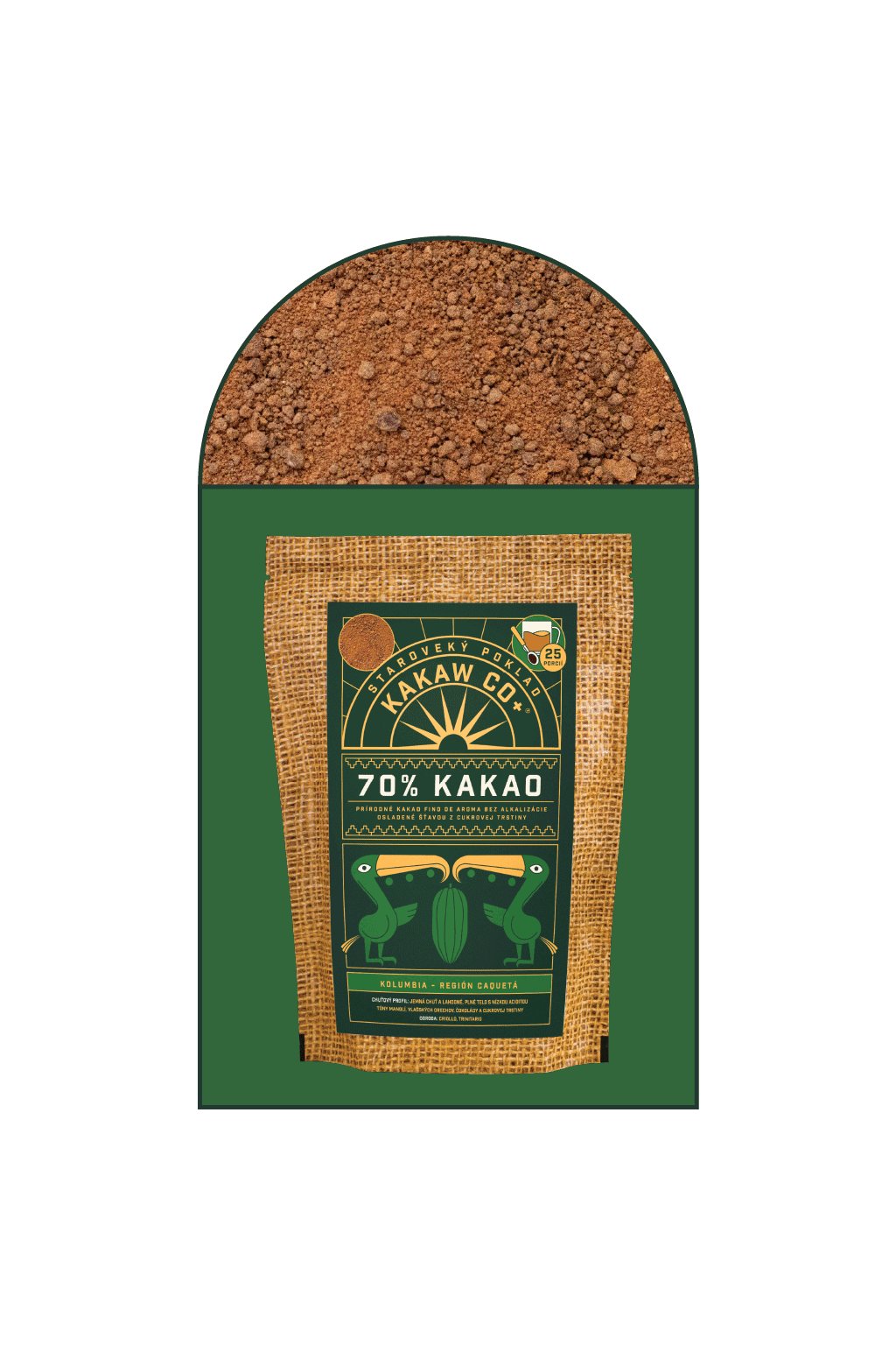 Neodtučněný a nealkalizovaný kakaový prášek jemně oslazený panelou obsahuje 70 % čisté kakaové hmoty vyrobené z kakaových bobů v prémiové kvalitě 'fino de aroma' a 30 % panely (nerafinované šťávy z cukrové třtiny).