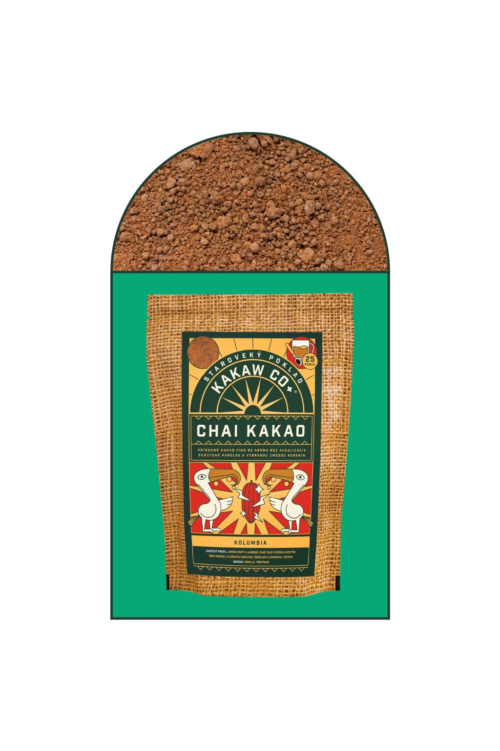 Kakaové boby použité pro výrobu tohoto produktu pocházejí výlučně ze sopečného kolumbijského regionu Tolimá, proto tato hořká čokoláda nese přívlastek single origin (pocházející pouze z jediného regionu). Boby byly vypěstovány a ručně sklizeny výlučně na jedné konkrétní plantáži, proto se čokoláda může pyšnit i přívlastkem single estate (pocházející pouze z jedné plantáže). Navíc je tato čokoláda vyrobena pouze z jediné odrůdy kakaa - criollo, a proto mluvíme také o prvotřídní odrůdové, tzv. kakaa. kakaa. varietal čokoládě. Obsah tuku v kakaové sušině je až 52%. Právě ve vysokém podílu tuku jsou obsaženy všechny zdraví prospěšné minerály – zejména hořčík, vápník, draslík a železo a vitamíny – především A, B1, B2, B3, C a E. 80 % Pomerančová sopečná čokoláda Kakaw Co+ obsahuje velké množství protizánětlivých antioxidantů systém, trávicí soustavu, schopnost koncentrace a na náladu. Čokoláda je ve tvaru (cca 5 g) peněz a je vhodná nejen k přímé konzumaci, ale pro výbornou rozpustnost a zajímavou pomerančovou dochuť i do pečení či vaření, k výrobě polév, čokoládových likérů a pod.