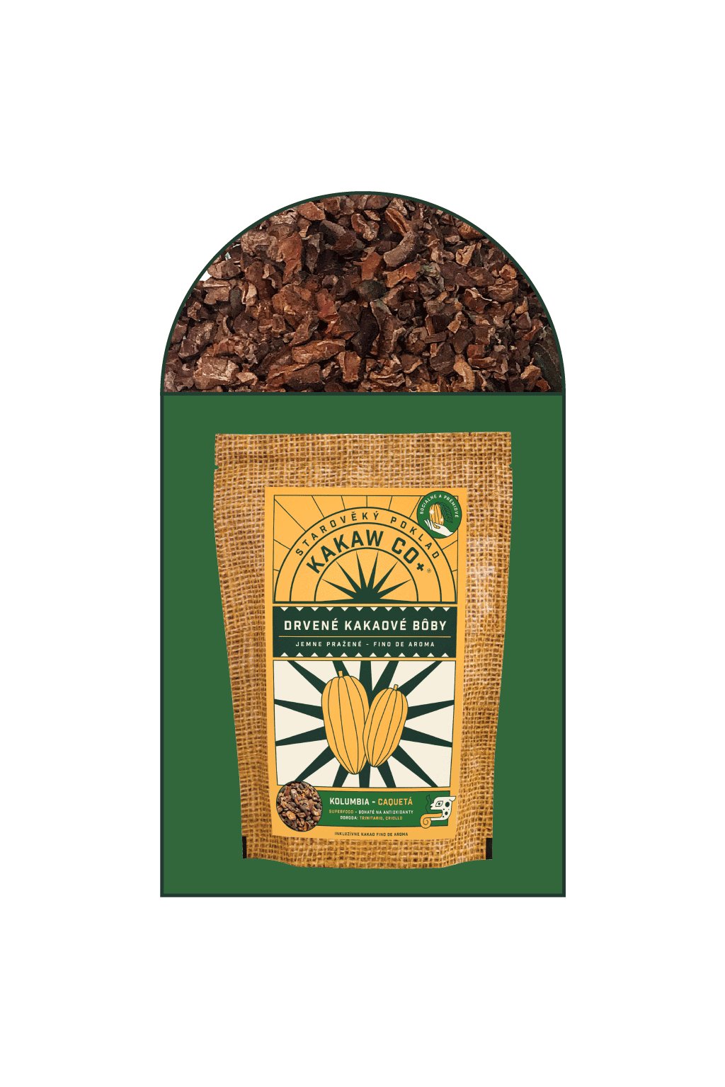 Boby v prémiové kvalitě 'fino de aroma' byly ručně sbírány, fermentovány, sušeny, jemně upraženy a rozdrveny na malé kousky – nibsy. Mají výjimečný čokoládový chuťový profil s jemnými tóny lískových ořechů, vanilky, karamelu a čokolády. Jsou rozdrveny na malé kousky, což je činí ideálními do pečení jako zdravou a křupavou náhradu ořechů či kousků čokolády. Boby pocházejí výhradně z kolumbijského regionu Caquetá, a proto nesou označení single origin (pocházející pouze z jednoho regionu). Byly pěstovány a ručně sbírány výhradně na jedné konkrétní plantáži, a proto se mohou pyšnit i označením single estate (pocházející pouze z jedné plantáže). Navíc se jedná o boby pouze jedné odrůdy kakaa - criollo, a proto mluvíme o prvotřídních odrůdových, tzv. varietal bobech. Obsah tuku v kakaové sušině je až 52 %. Právě ve vysokém podílu tuku jsou obsaženy všechny zdraví prospěšné minerály – především hořčík, vápník, draslík a železo a vitamíny – zejména A, B1, B2, B3, C a E. Drcené kakaové boby Kakaw Co+ obsahují velké množství protizánětlivých antioxidantů, jsou bohaté na teobromin, příznivě působí na náš nervový a oběhový systém, trávicí soustavu, schopnost koncentrace a na náladu.